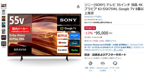 【Amazon得報】55V型4Kブラビアが12%オフの13,800円!