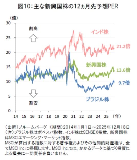 足元で堅調な株高が進む中でも、ブラジル株の予想PERは9倍台と割安な水準にあり、新興国株の中においてブラジル株への見直しの余地は残されています[図表10]。