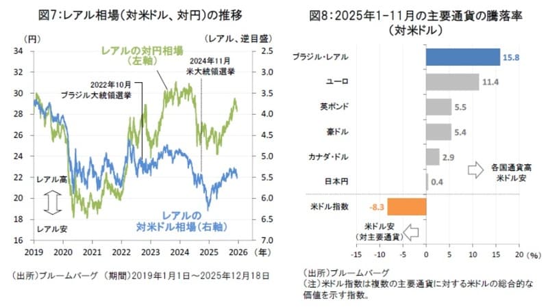 2025年は主要通貨に対する米ドル安が進む中、新興国市場に投資家の注目が集まり、金利差の面などからレアルへの見直しの動きが広がりました[図表7・8]。