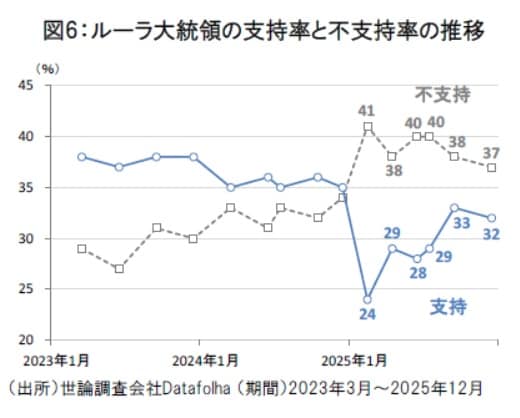 現職のルーラ大統領は再選を目指す意向を示しており、大統領選挙の第一の有力候補です。ルーラ氏の支持率はトランプ政権との関係改善を図った功績から回復傾向にあるものの、不支持率も高いことから必ずしも盤石な状態とは言えません[図表6]。一方、右派陣営では、ボルソナロ前大統領が後継候補に指名した長男のフラビオ・ボルソナロ上院議員などが有力候補として浮上しています。