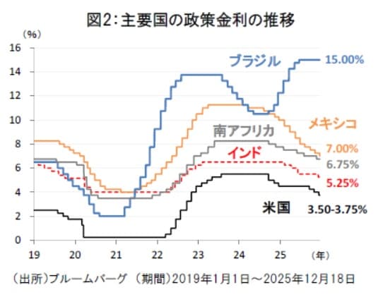 金利環境の面では、ブラジル中銀はインフレ懸念の再燃を背景に、2024年後半から利上げに転じ、現在の政策金利は15.00%の高水準に達しています。特に米国や他の新興国とは異なる金融政策のサイクルで利上げが進められてきたことが、分散投資先としてのブラジルの再評価に繋がっていると考えられます[図表2]。