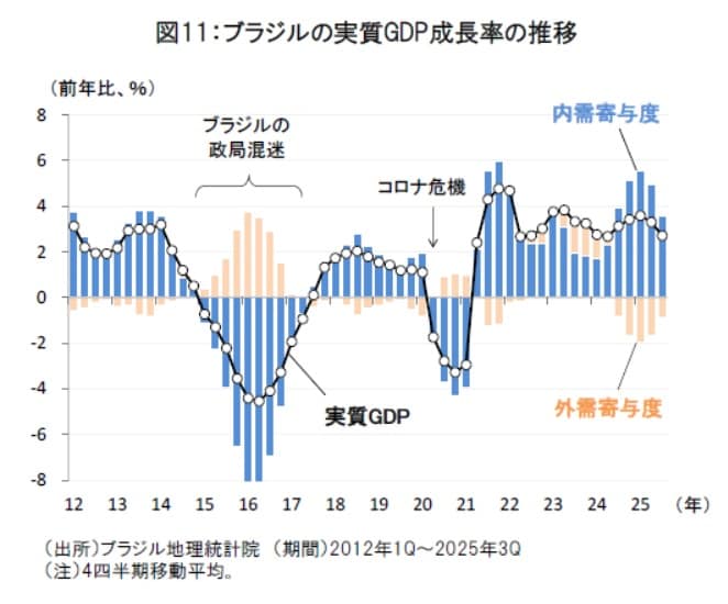 2026年にはインフレ圧力の後退に伴って、ブラジル中銀の利下げ余地が生まれるとみられます。市場予想では、2026年3月以降、中銀が利下げに転じるとの見方が大勢であり、政策金利は2027年末には10.50%まで引き下げられると見込まれています[図表9]。足元で14%近辺にあるブラジル国債利回りは、2026年には緩やかな低下(債券価格は上昇)に向かう可能性がありそうです。