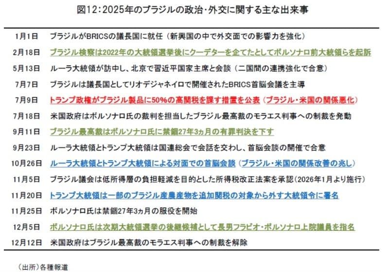 ブラジル国内ではクーデターを企てた罪からボルソナロ前大統領の起訴と裁判が進む中、ボルソナロ氏の盟友とされるトランプ大統領は2025年7月にブラジルに対して50%の大幅関税を課す措置を公表しました[図表12]。