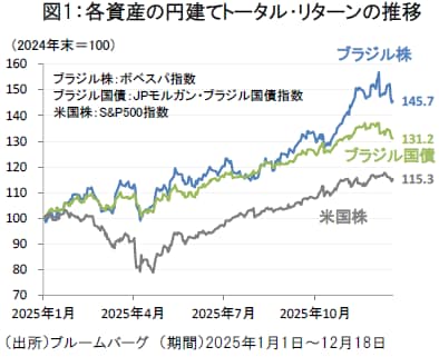 2025年はブラジル資産の円建てパフォーマンスが大きく改善した年となりました。ブラジル株やブラジル国債の円建ての投資収益(トータル・リターン)は、年初来で米国株を上回る好調を維持しています[図表1]。