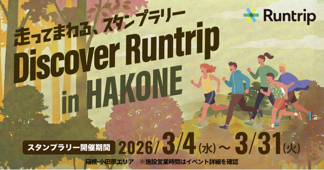 ランニングアプリ「Runtrip」を運営する株式会社ラントリップ(本社:東京都渋谷区、代表取締役:大森 英一郎)は、小田急電鉄株式会社(本社:東京都新宿区、代表取締役:鈴木 滋)が主催する、心豊かなライフスタイルを提案するイベント「HOME FOREST」の一環として、箱根・小田原エリアを舞台にした地域回遊型のランニングスタンプラリー『Discover Runtrip in HAKONE』を2026年3月4日(水)より開催いたします。本イベントの詳細はページはこちら