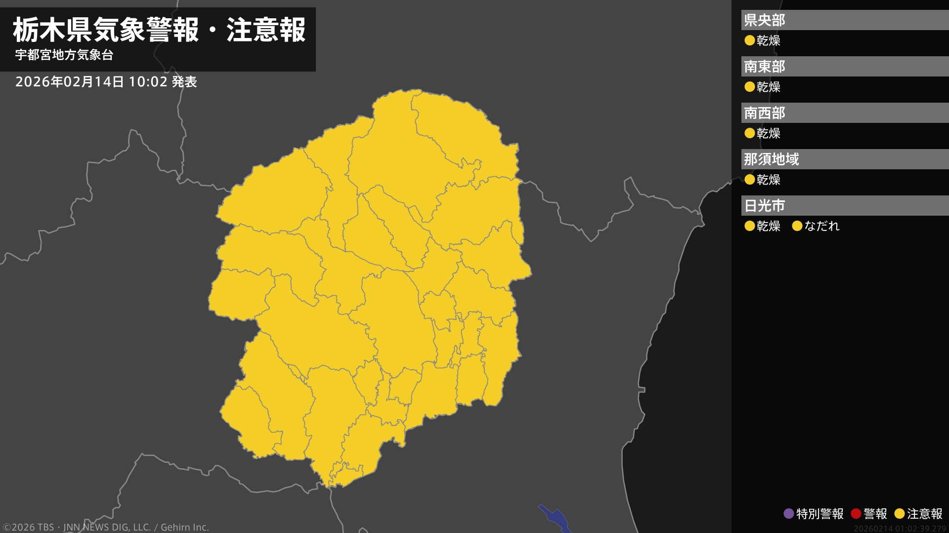 栃木県では、16日まで空気の乾燥した状態が続くため、火の取り扱いに注意してください。北部では、15日までなだれに注意してください。