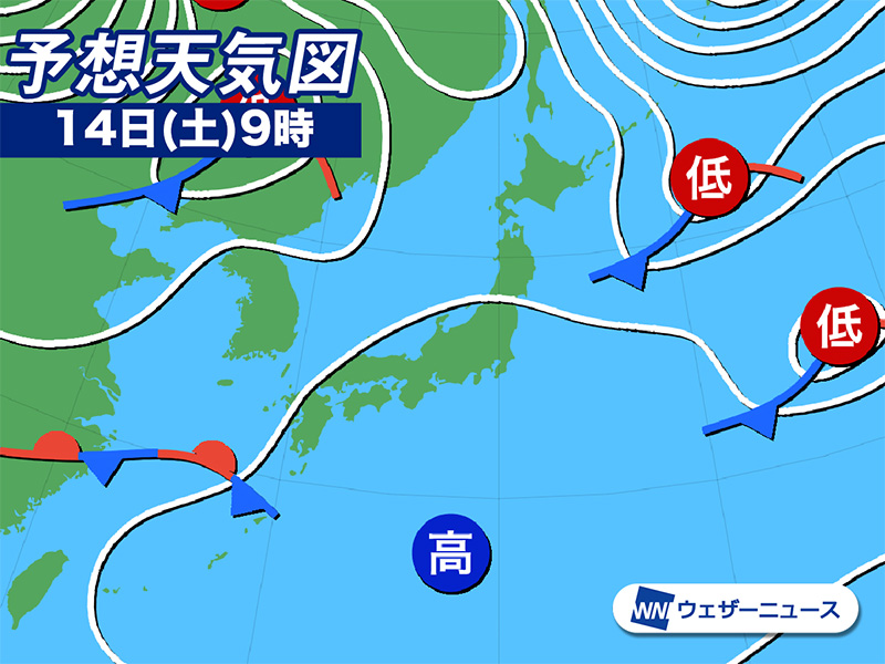 バレンタインデーの今日14日(土)は、広い範囲で晴れてお出かけ日和になります。昼間は気温が上がり、過ごしやすい陽気になりそうです。積雪の多い地域は融雪に注意をしてください。九州は天気が下り坂になるため、外出する場合は折りたたみ傘をご用意ください。